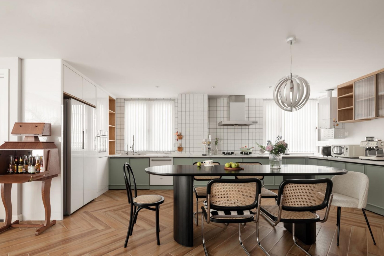 开放式餐厅自由又浪漫。绿色点缀其中,生意盎然。打通后的空间开阔自在,宝宝可以随心随遇地玩耍、跑闹。