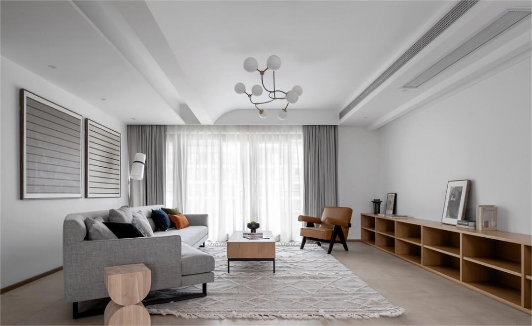 迎合老人的习惯让其更舒适,减小客厅空间尺度,增加独立储物空间。采用白色涂料作为主体的装饰材料,增加户内的光线亮度,大地色系的哑光地砖将白色调性的空间变得有烟火气,而木色使得空间更有亲和力。顶面通过弧形造型暗藏线性光源,将氛围感拉满,客厅沙发采用岛型设计,预留出“洄游”动线,为小孩好动的天性预留活动空间