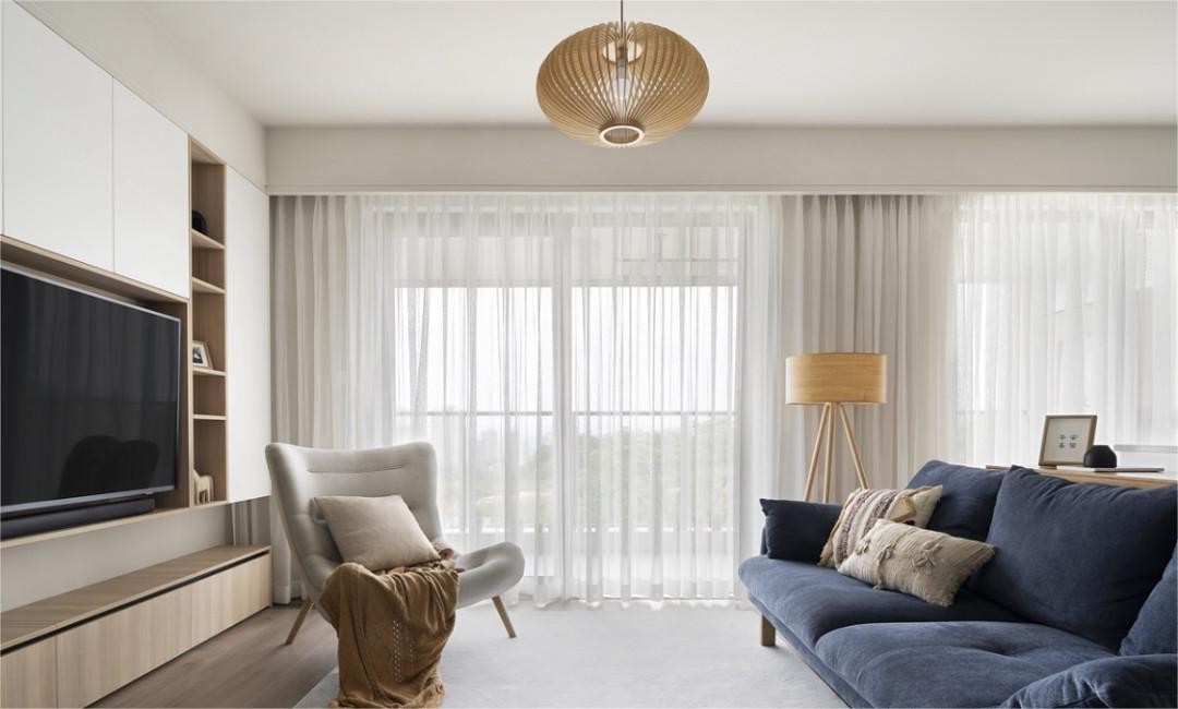 紧凑而温馨的空间中,其中也不乏微妙的饰件。客厅以白色为主去除多余的装饰,组合画与空间相融合体现质感与品味。雾霾蓝的沙发,为整个空间添了一抹亮色。日式吊灯位于地毯中心上方,地毯摆在电视墙的平行位置,与懒人椅的色彩相呼应,空间舒适度up。整体的氛围恰到好处,既让住户拥有了的视听体验,也为空间增添了几分温度