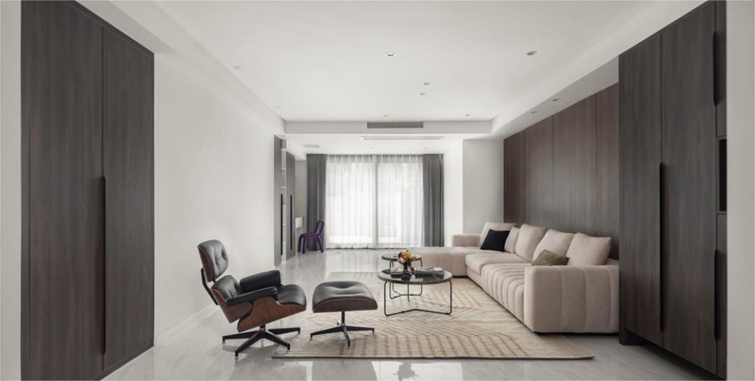没有拘泥风格, 也没有刻意去做一些电视墙之类的造型。 预留出白墙尺度方便使用投影后, 增加收纳空间,柜门与墙面齐平, 自然形成空间的切割。 错位墙体做储物和书桌, 窗边的优势不用担心采光问题
