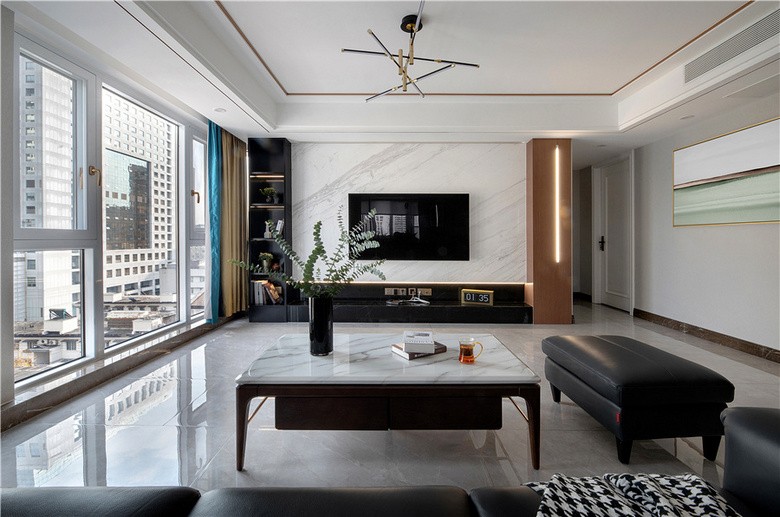 客厅采用极具设计感的金属设计主灯搭配干净利落的线条灯,简洁视觉的同时空间也得到了更大的舒展。