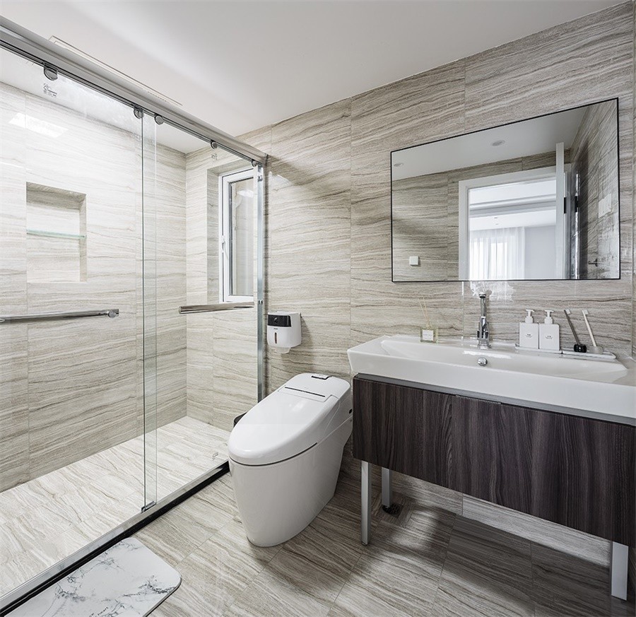 卫生间明亮干净,淋浴房里的壁龛可放置常用清洁用品。