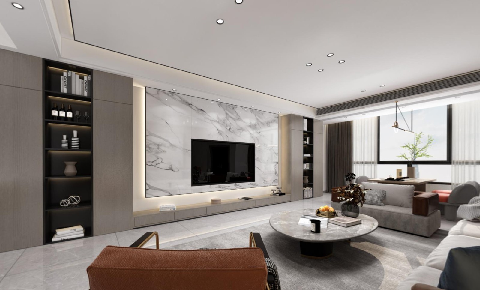 背景墙储物柜延伸至餐厅过道旁,功能性增强