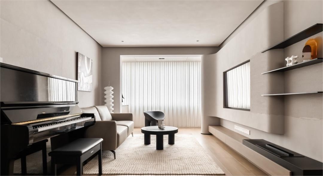 在客厅保留了他们小孩用了20年的的黑色钢琴 -直线条与圆弧贯通行背景墙,完美的契合成一个流线性空间 -沙发背后用了微水泥的墙面处理,还原侘寂风的原始朴素的质感