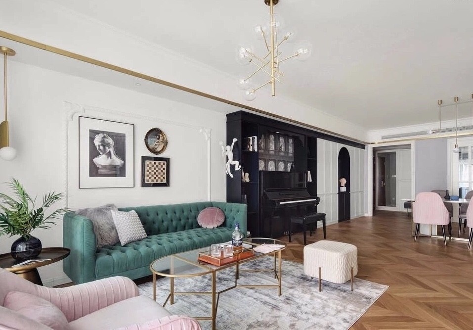 色彩选用灰粉,灰绿和黑色,基调统一的软装饰品,呼应主题风格。材质选用较网红的金属镀铜,小手工砖,水磨石,天鹅绒,鱼骨拼地板等,配合拱形弧形等造型元素让整个空间显得明快且有品质。