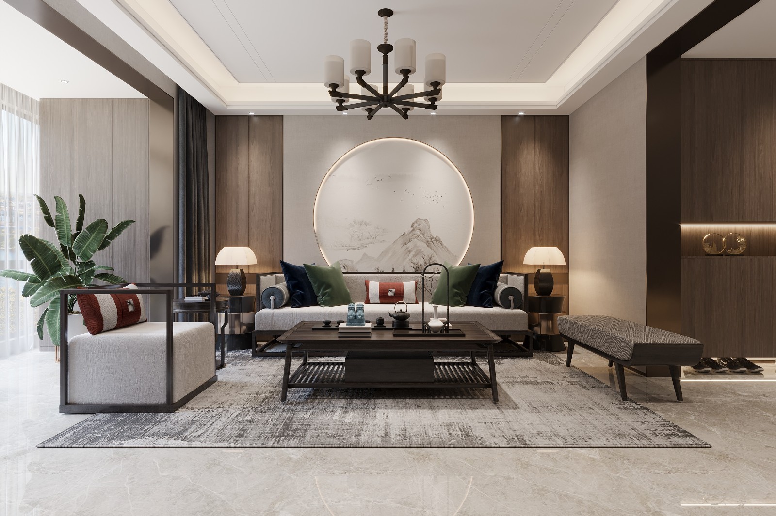 沙发背景以中式圆窗的形式做山水壁纸。