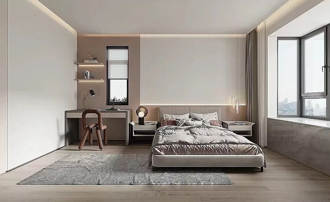 卧室主用奶咖、会色为主色调,床头背景墙刷色漆
