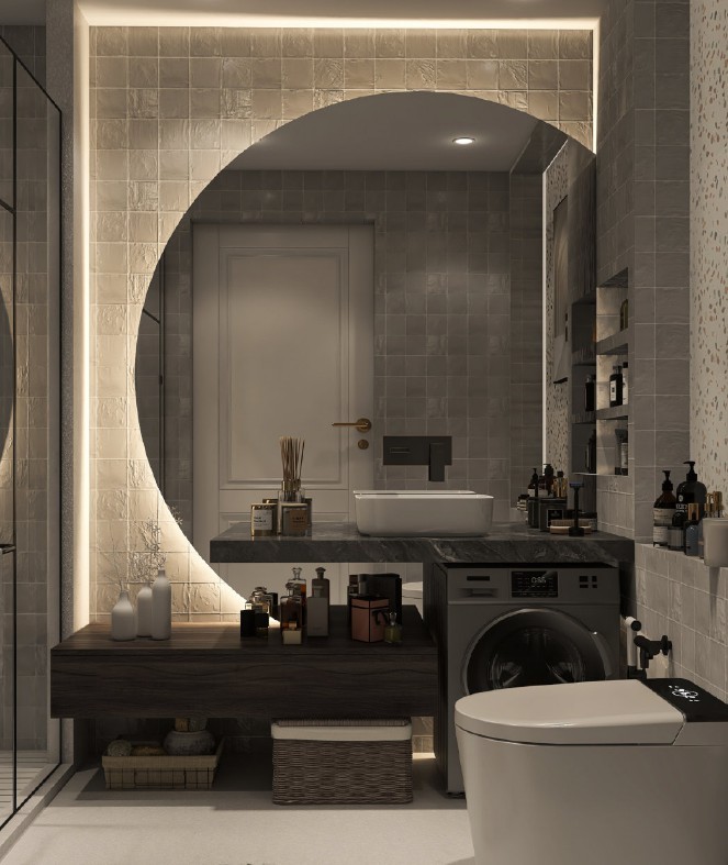 卫生间和之前元素一样,采用一大面圆形镜子,视觉上增大空间,柔和的灯光让人舒适不少