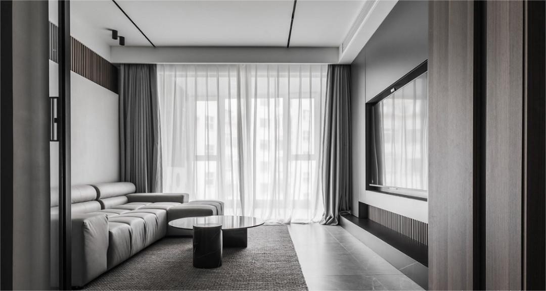 推开门,入眼便知这是个极具个性的黑白灰之家。灰色电视背景墙与对面白色形成对比,皮质浅咖色沙发,黑色简约茶几在色调上高度和谐。客厅和厨房用一道移门进行区隔,业主可自行选择开放性还是隐私性,满足多种生活需求