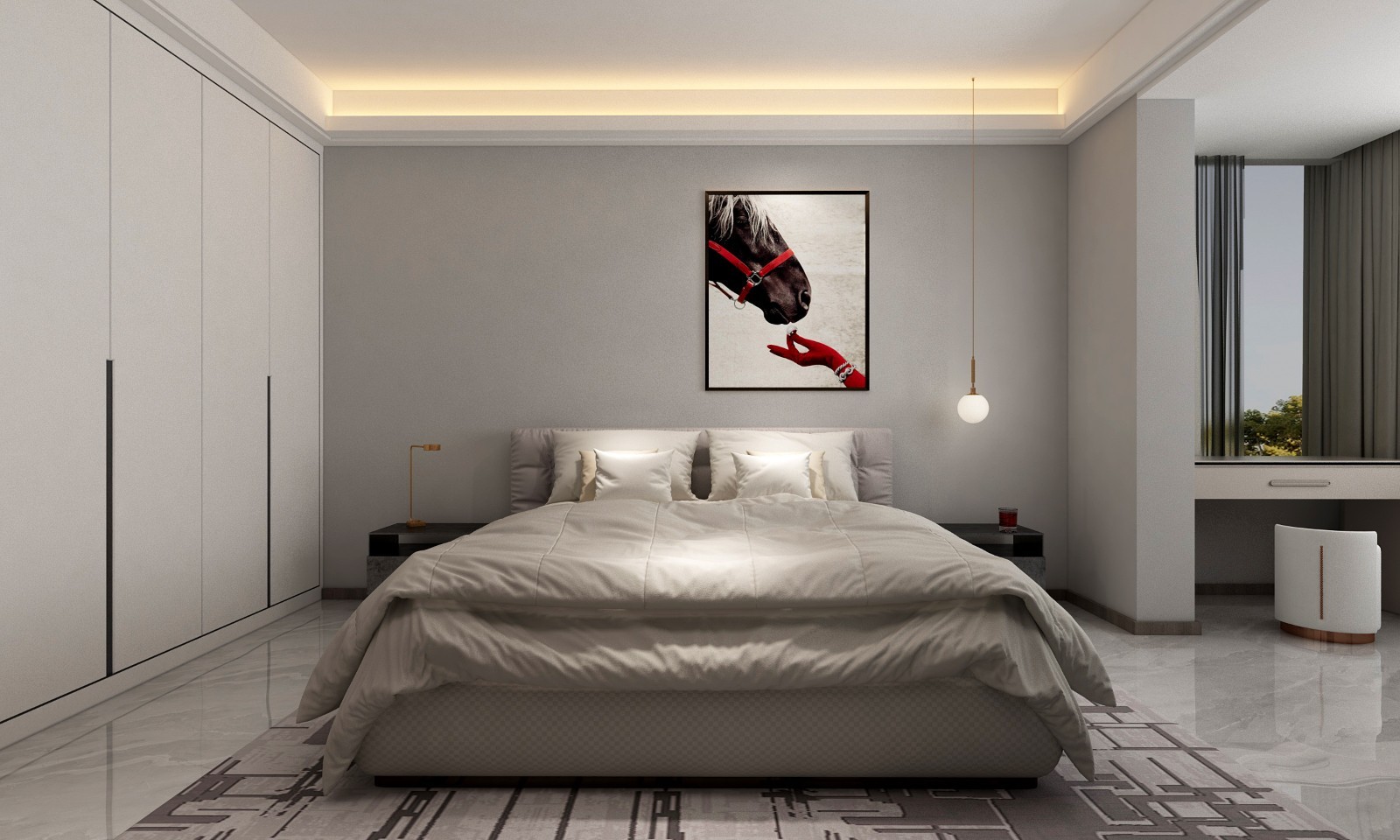 床尾为女主人打造了一整排收纳+台面组合,不仅有限利用了空间,还让空间更有了整体性。