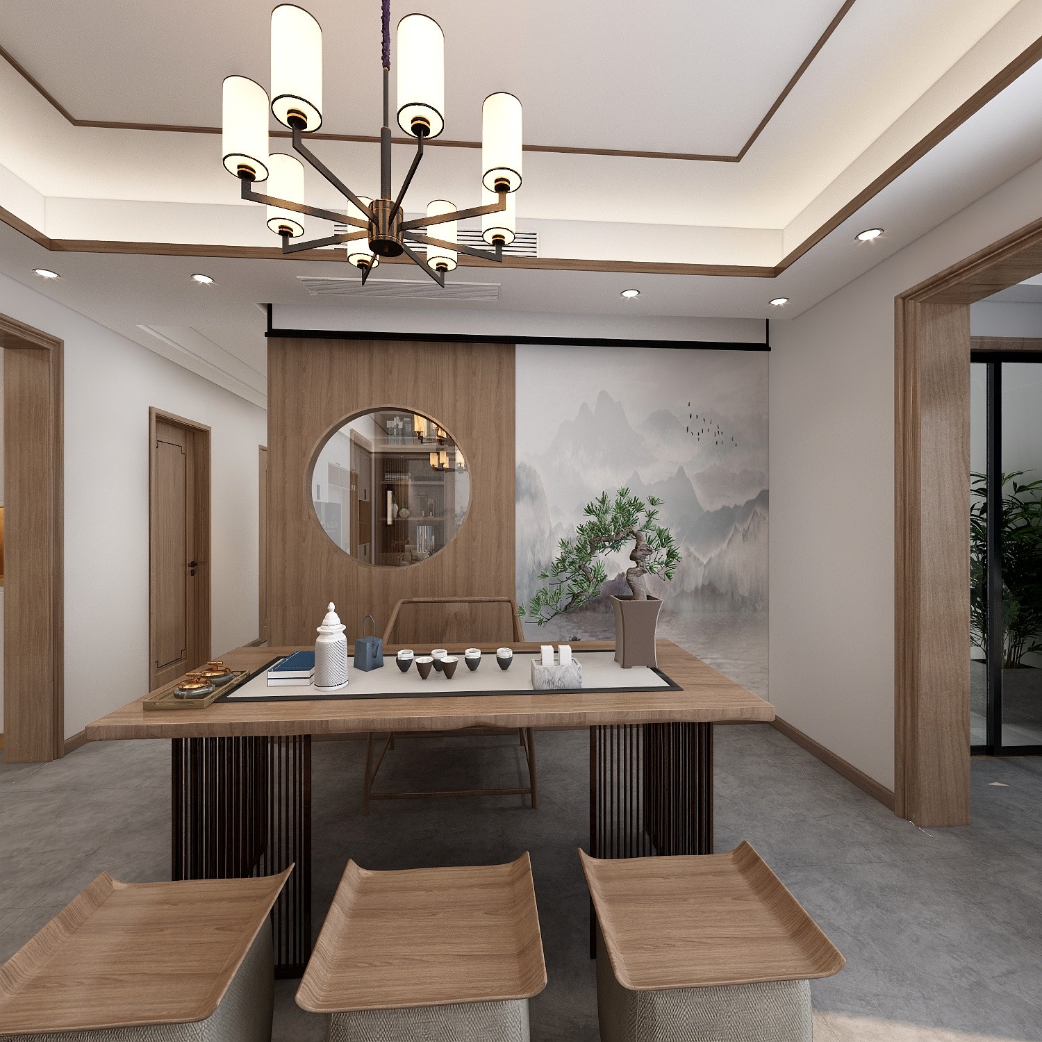 本户型是四房两卫户型,入户和厨房结构有一定的冲突,将本案改动***的地方是改成开放厨房,餐厨一体化设计,将原始餐厅位置改成茶室,功能更细化,书房是业主女儿练琴使用,故将茶室和书房中间开圆形孔洞加玻璃及灯带来烘托氛围,让空间更加有中式的韵味。客厅阳台则打通,将传统电视墙改变方向,客厅不只是会客,更是一个聚会,休闲开放自由的地方。