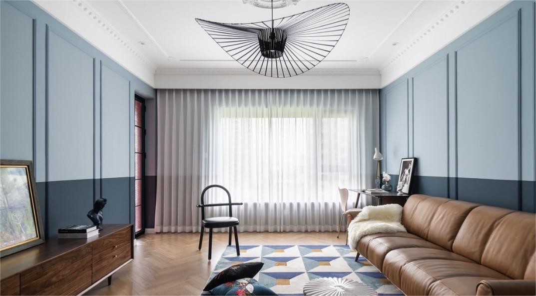 根据业主喜欢的风格墙面做了一些立体式细条石膏线,并刷了半高分色的涂料颜色,来美化空间纵向和竖向的比例感,让整体客厅的视觉纵深感显得很长。 -地面选择了尺寸稍长的人字地板,因为客厅地面空间偏大,如果用太细太小的人字地板会显得地面更加琐碎 -客厅地面在后期软装搭配上添置了一块柔软的超大地毯,分格的蓝色,舒适的足感同时也可以弱化一点地面的面积。