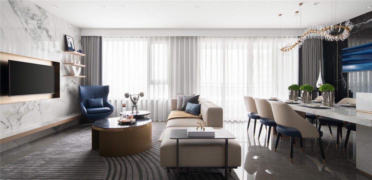 以利落明快的设计语言,以带有宝石光泽的蓝色调渲染空间格调,横厅大平层开放式空间布局,延伸空间尺度,结合大面积落地窗,打造出一个契合都市菁英的时尚空间。