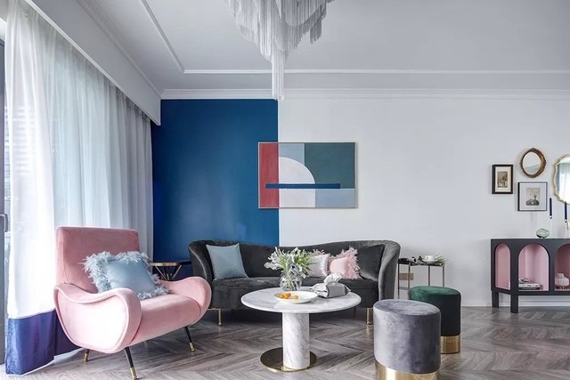 主卧通过蓝色与粉色的碰撞搭配,注入了复古活力的气息。用唯美浪漫的羽毛灯来烘托气氛,显得空间雅致温柔。