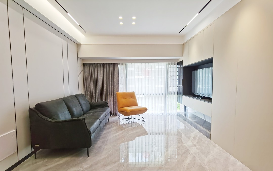 悬空氛围感,大理石背景墙打底,做整面定制电视柜,透色玻璃质感放饰品。
