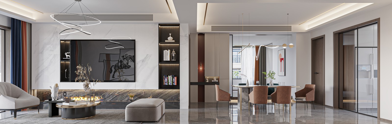 客餐厅选用基础白色乳胶漆作为主色调,入户玄关的定制柜小景和开方式多功能房令人眼前一亮,空间的开阔感迎面而来