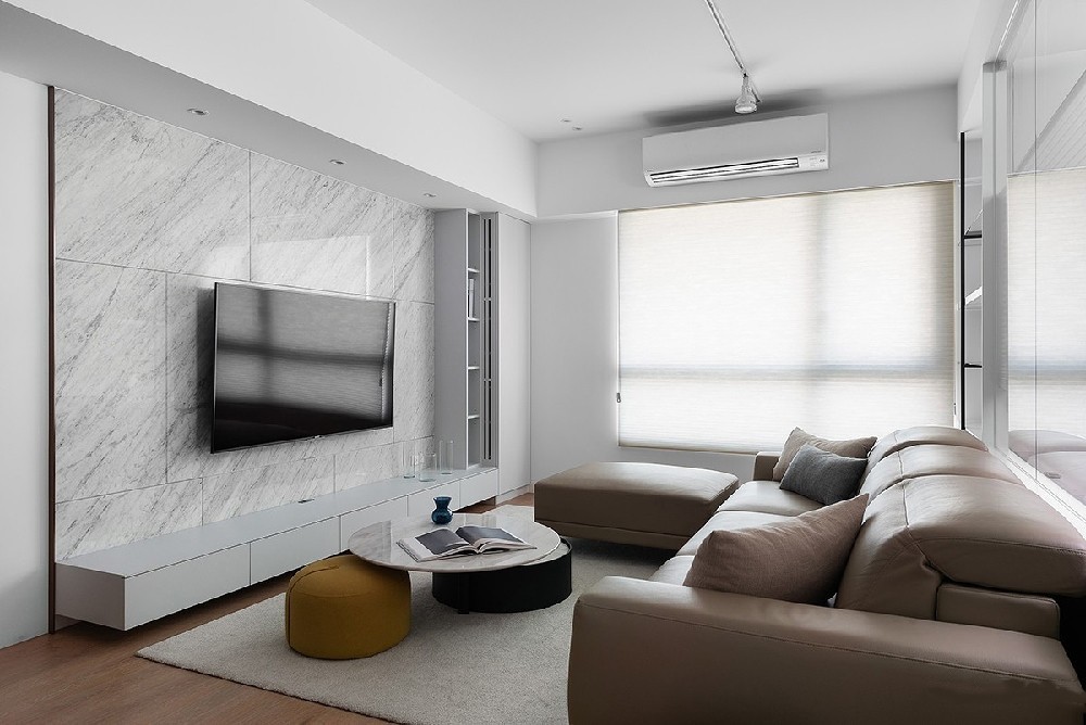 客厅通透开敞的视觉感受外,也在书房与客厅的玻璃介面,设置风琴帘,让阅读或工作时候保有独立的隐密性。