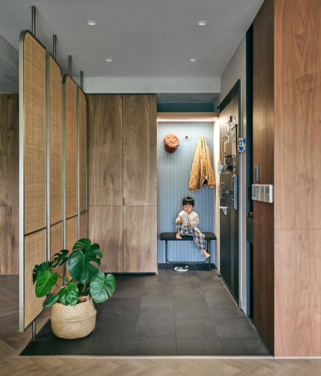 光影彷若走进这间屋子,便以深色石塑地坪落尘区 可见光影沿着四面 360 度旋转藤编造型屏风