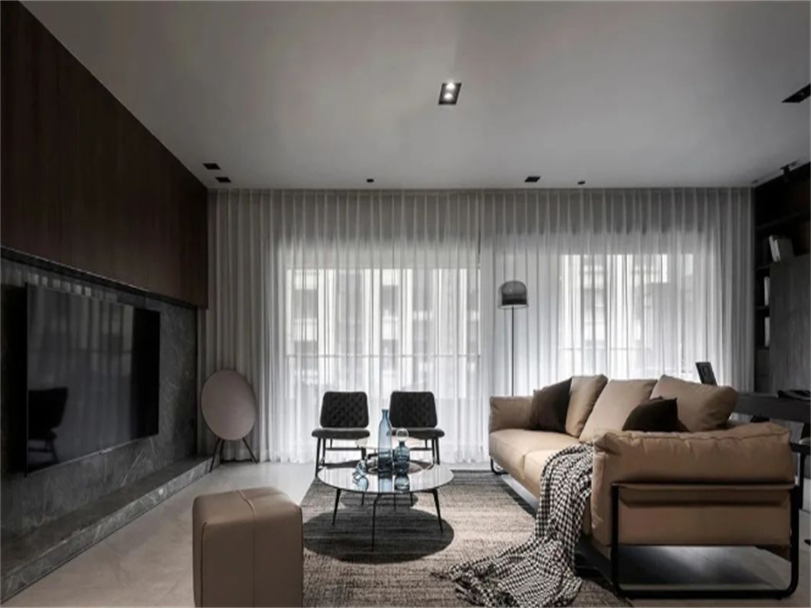 客厅与书房打通后形成大横厅格局,显得开阔通透,阳台采用轻盈的薄纱呈现出轻松舒适的氛围