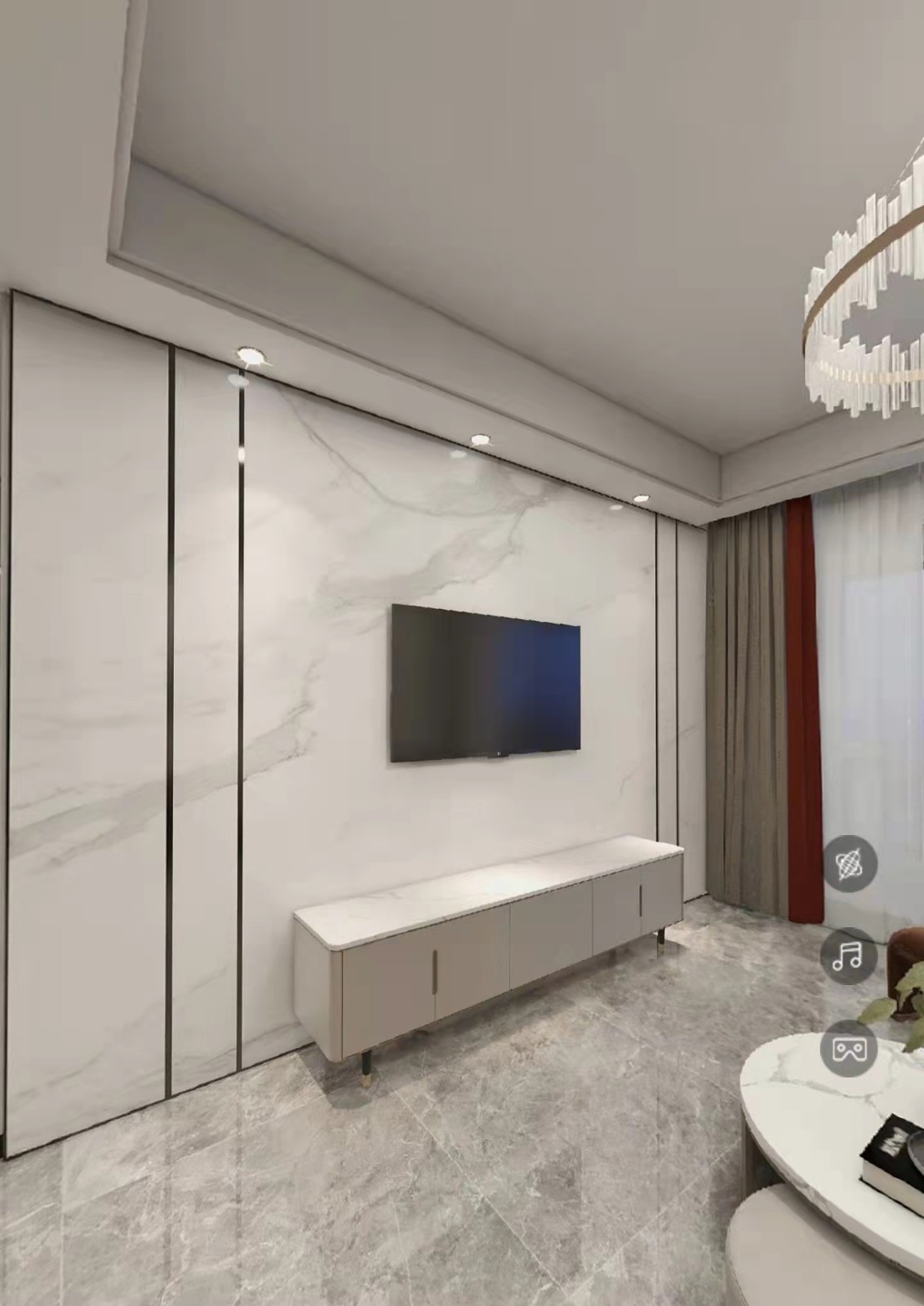 客厅电视背景墙采用整幅岩板上墙,搭配金属线条,凸显线条感。