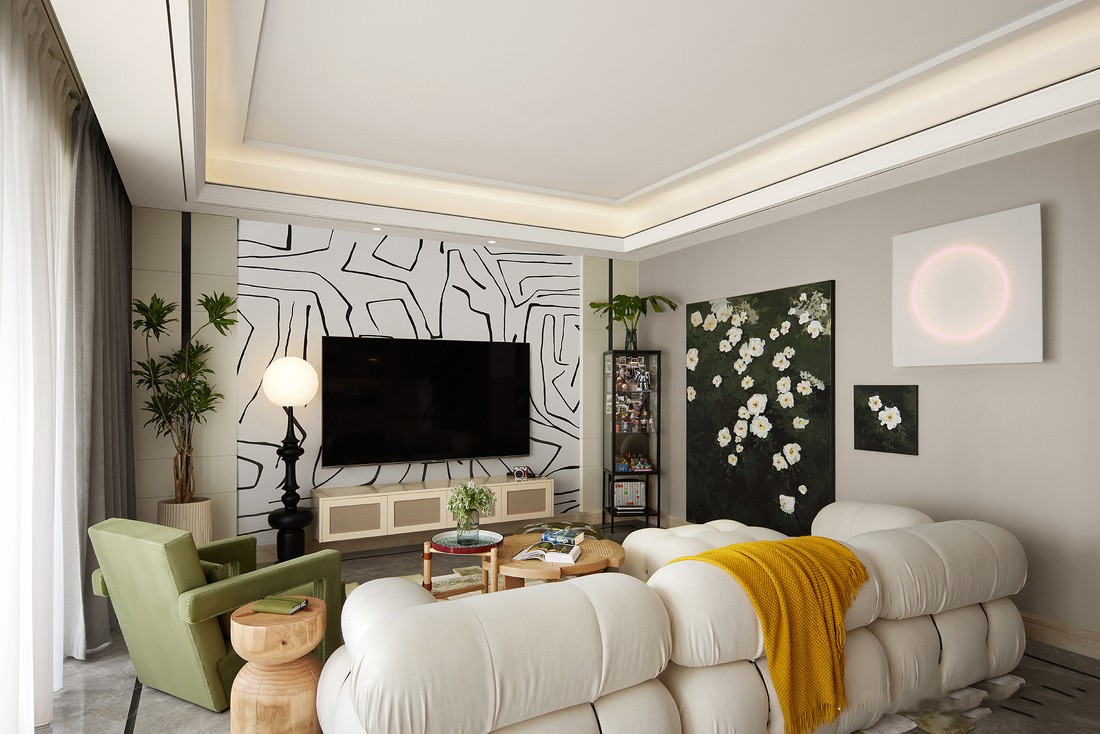 柔软轻盈的乳白色云朵沙发,为归家的倦侣卸下疲惫,让他们回归家的温柔怀抱。