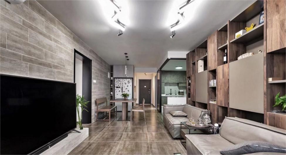 全屋除去厨卫空间之外,皆铺以木色的水泥砖,而客厅和餐厅墙面都采用浅色仿木纹地砖(地砖上墙是装修方式的一种),直线条切割勾勒出简约的轻工业氛围