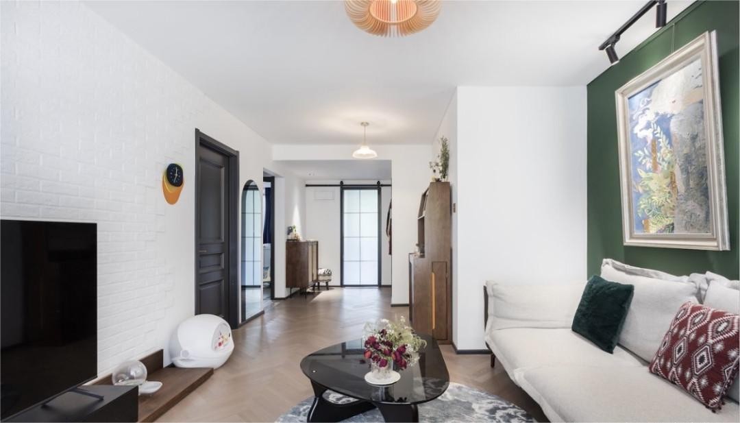 客厅的色彩基调选择了富有戏剧感的红绿配色,墨绿色墙面搭配红丝绒窗帘,营造出丰富流畅、饱满而有情感张力的空间体验。