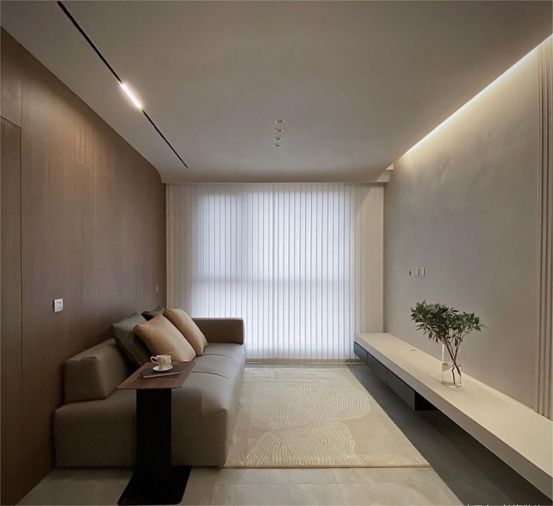 客厅墙面跟顶面采用艺术漆来表现,塑造出斑驳的质感。地砖也采用跟墙面同色系来增加空间的整体感