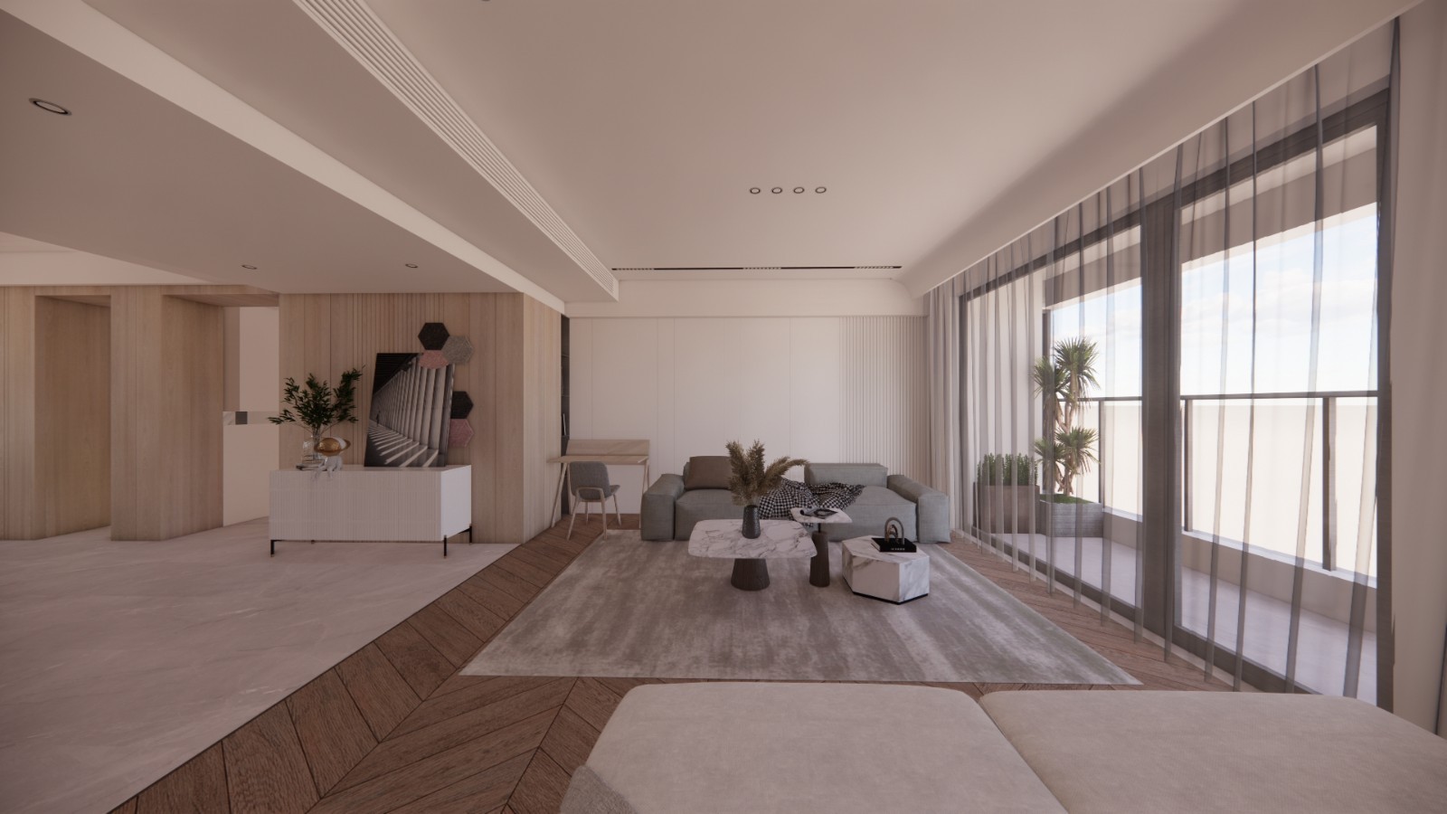 客厅空间大,整体以休闲简约为主,地面采用了实木地板人字形铺贴,与过道瓷砖区分开来,区域划分更明显一些。