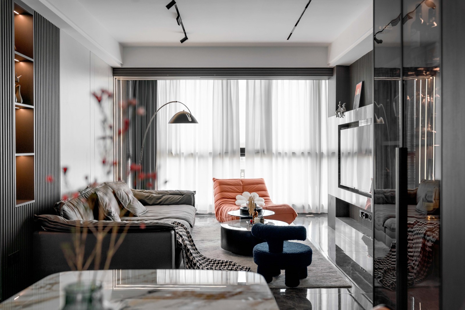 沙发休闲区由一字型皮沙发和两把个性单椅围合摆放而成,时髦的都市腔调中自带俏皮灵动。
