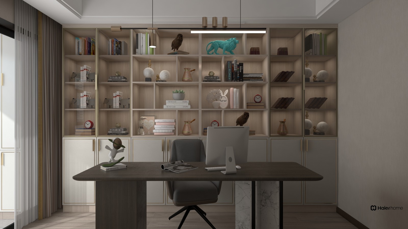 书房开门柜+开放柜设计。灯带点缀。