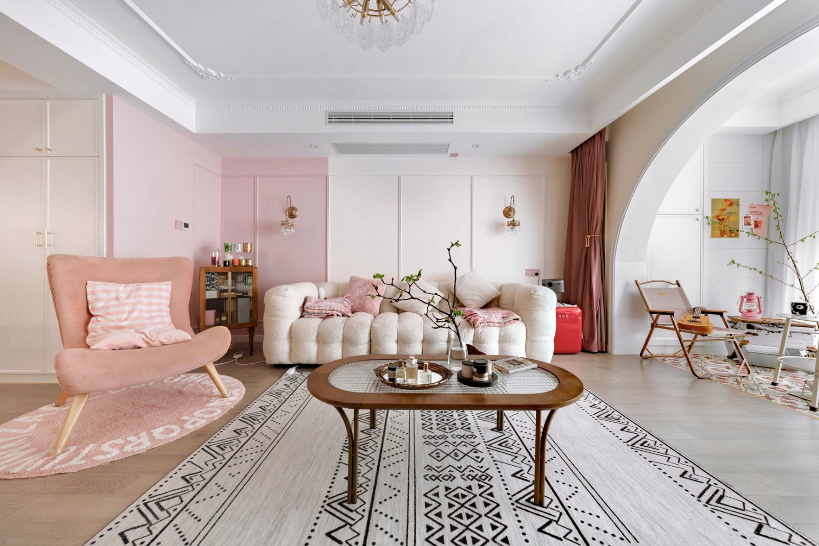 环视全屋会发现,空间不再单纯为了功能而造,而是延伸出了关于美学维度的探索。全屋以粉色加暖白的搭配,营造出温暖又优雅的简法式基调。
