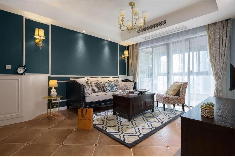 客厅精致舒适,翡翠绿的蚕丝壁纸装饰沙发墙,清晰的纹路凸显出质感,搭配上白色石膏线条和美式壁灯,彰显大气之感。沙发另辟蹊径,没有选择大众简美沙发,而是选择了比较大气的黑色沙发,搭配上红色花纹单椅,让美式特性更显著。