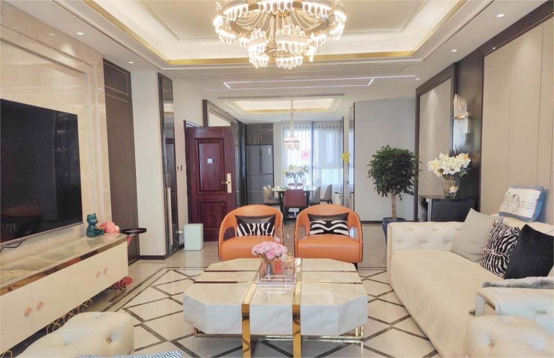 客厅吊顶采用金色线条封边,配上水晶吊灯,与空间的主题合理搭配,是整个空间,毫无违和感。