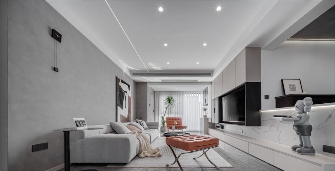 客厅采用的是无主灯设计,整体采用筒灯和线性灯作为主要光源,为了增加客厅的层高,我们把中央空调的位置设计在了客厅最靠里,接近阳台区域的位置 还设计了休闲阳台区域,既能喝茶又能晒太阳,阳台绿色的植物,让整个空间多了一些生机#客厅#无主灯设计#筒灯#线性灯#中央空调