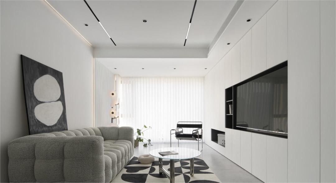 客厅直接连接阳台,让视野更加地开阔,使得整个公共空间变得十分敞亮,既能各自为区,又互为联系 一整排电视机背景柜进行收纳,把电视机入嵌到柜子当中,避免整体太过于单调,设计了两个展示区域