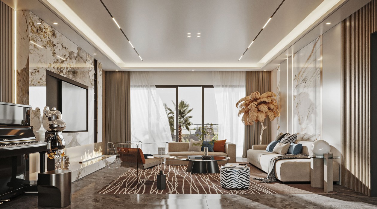 客厅以岩板加实木护墙板为主