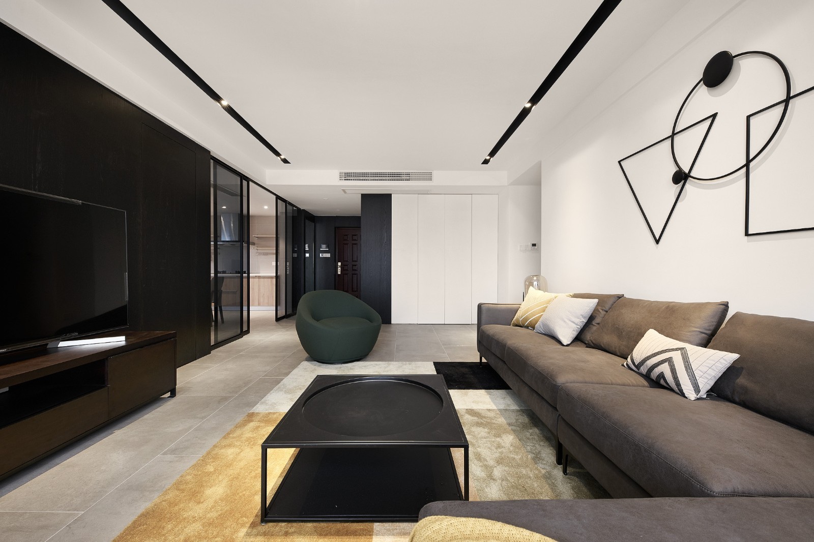 客厅贯穿东西,黑白配色简洁不失质感。 储藏间房门隐在柜体中,干净不拖泥带水。 细窄的黑色线条增强空间的立体感,点缀的亮色冲淡了冰冷。