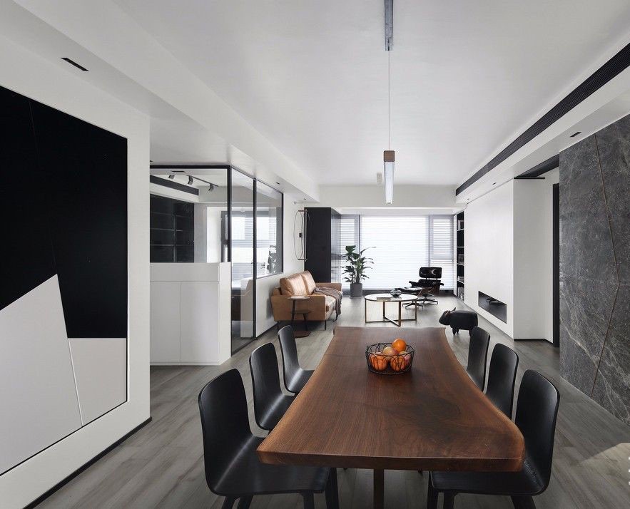 以黑白灰色为空间基调——入户便能感受到整个空间浓郁的简约现代风,其中沙发作为客厅中的主体家具,以暖色调棕色进行点缀、中和。