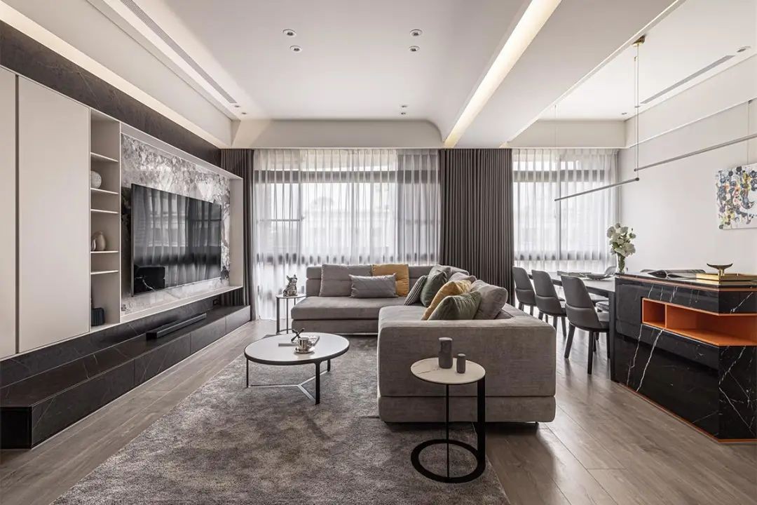 客厅与餐厅间,有一式大且宽的低梁,从餐厅贯穿至玄关,两侧引注灯光以弱化量体视觉感,因侧边灯源,正好作为两区照明,餐吊灯以管状长向造型摆设,下方置入一张多功能白系陶板桌,推升用餐之明亮感。