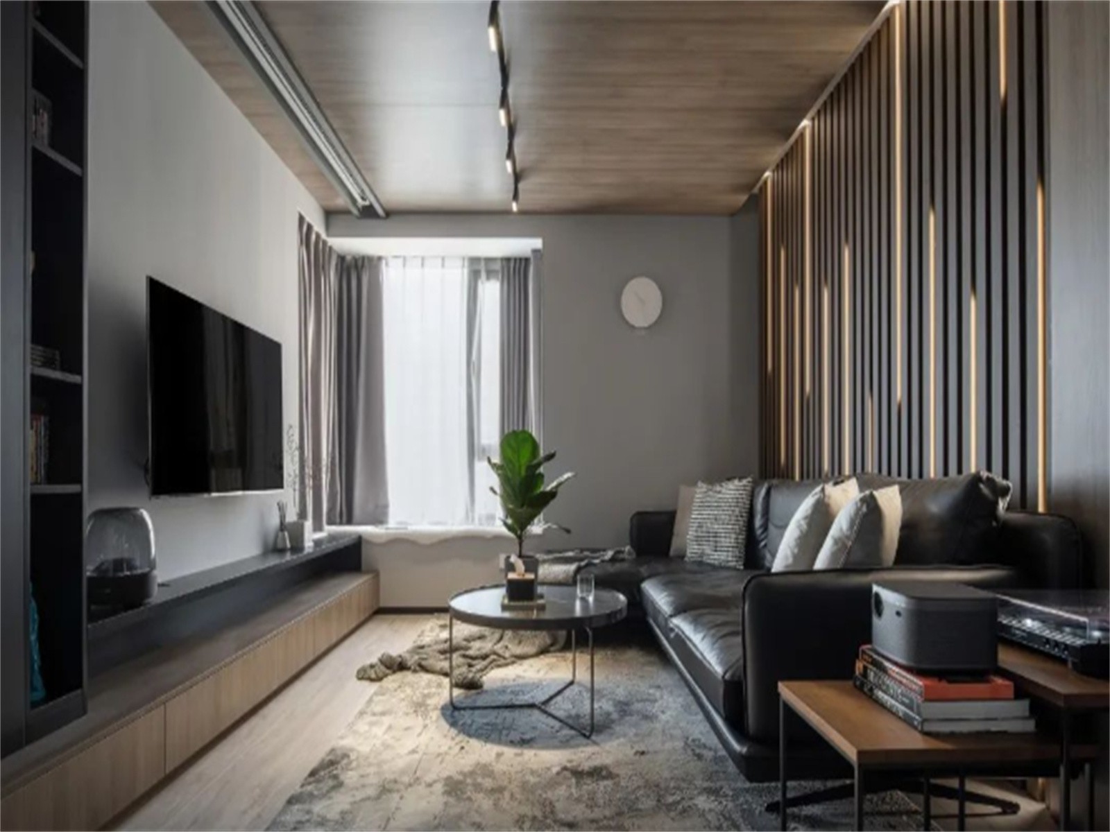 黑白灰的客厅加入大面积木饰面中和,低调内敛,木饰面吊顶内还内嵌了投影幕布,带来更好的观影效果