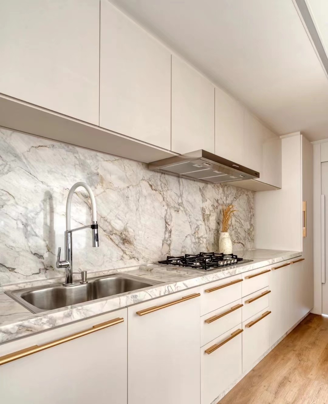 厨房白色的柜体配上金色的拉手与墙面石材相互呼应着,没有多余之感,仿佛理应如此。