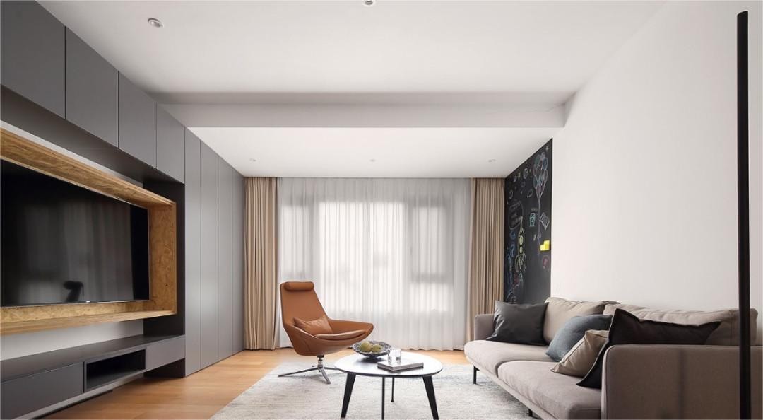 因为家里有个三岁左右的孩子,正是喜欢涂抹画画的年纪,所以在客厅靠近阳台处为小朋友设置了一个黑板墙,让他有固定的画画区域,以避免其在其他区域进行“创作”。 #黑板墙