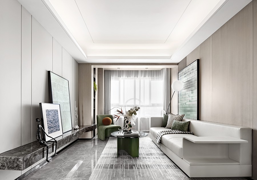 大规格的灰色暗纹花纹瓷砖一铺到底,与浅色的墙面一起围合出开放清澈的室内空间