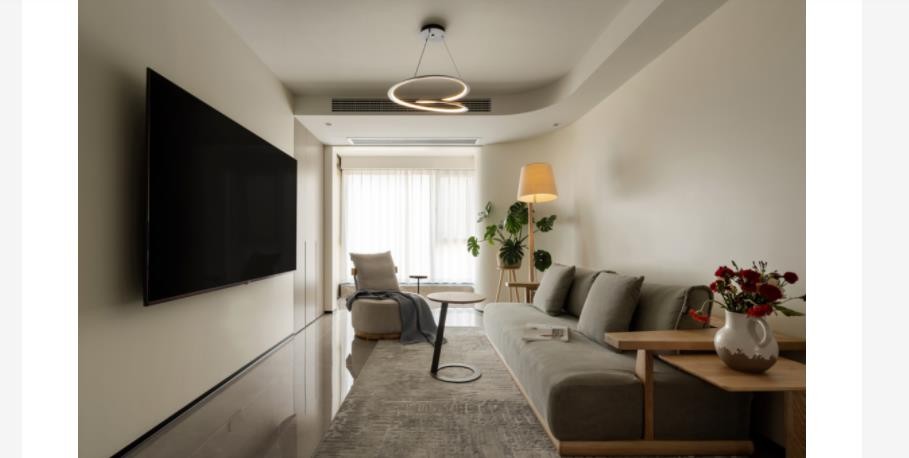 空间采用流线型设计语言,将狭长起居空间做了柔性的处理。长阳台一分为二,保留了一个家政间之后,让出空间划到起居室的一偶,阳光任性射入,透过龟背竹幻化出温柔的符号,让生活呈现出随性的气息。