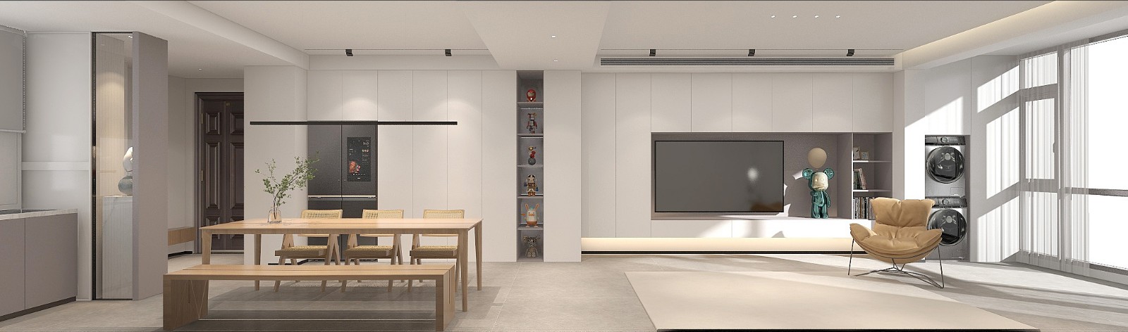 标准三房户型,两夫妻和两个女儿。比较注重厨房,喜欢美食,厨房台面长达6米,再加上岛台3米。在厨房烹饪是一种享受。取消了一个卫生间,做了衣帽间。小女儿还小,做了高架床,下面作为儿童活动空间。卫生间干湿分离。阳台纳入客厅空间。洗衣机加上烘干机也能满足需求。