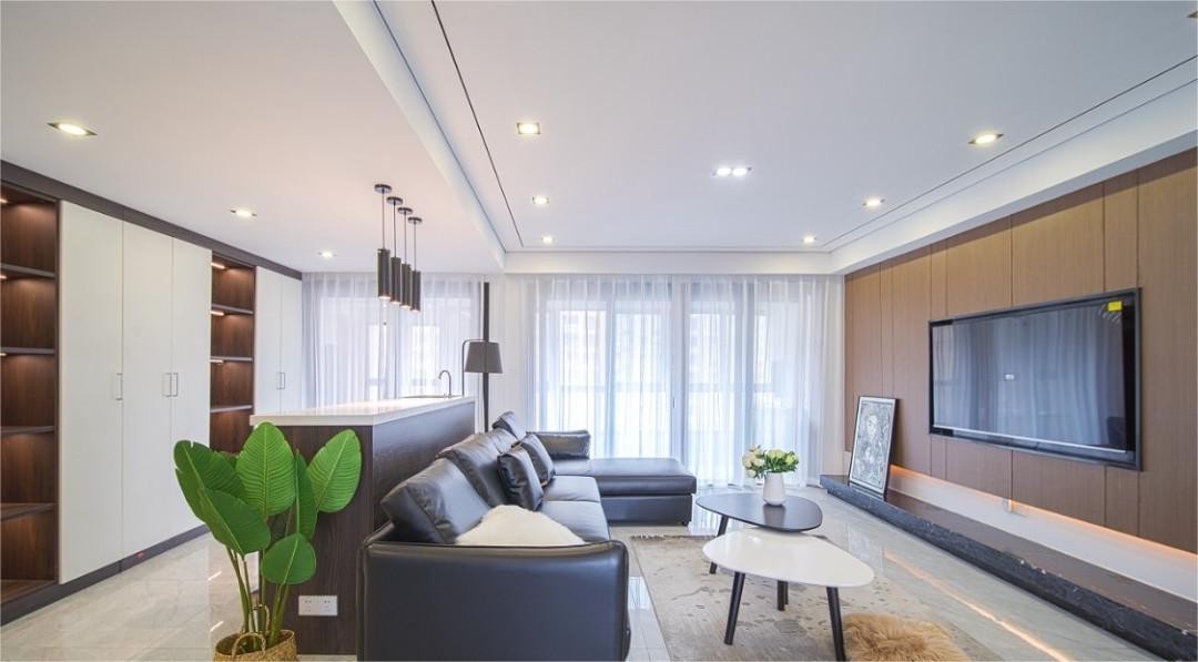 客厅以纯白为主基调,电视背景墙选用时下非常流行的木饰面。黑色真皮沙发,碰撞空间的白,简单却不单调。茶几样式既有创意又很个性,满足家用同时,视觉上显得更加清爽