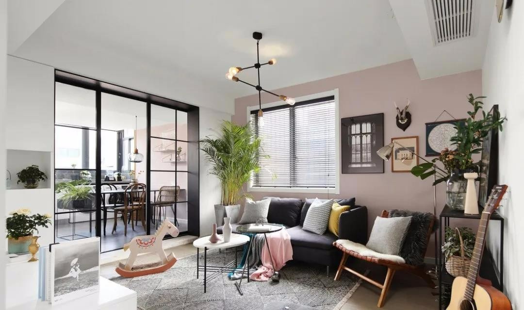 客厅,沙发背景墙选择了少女心满满却不落俗套的脏粉色系。