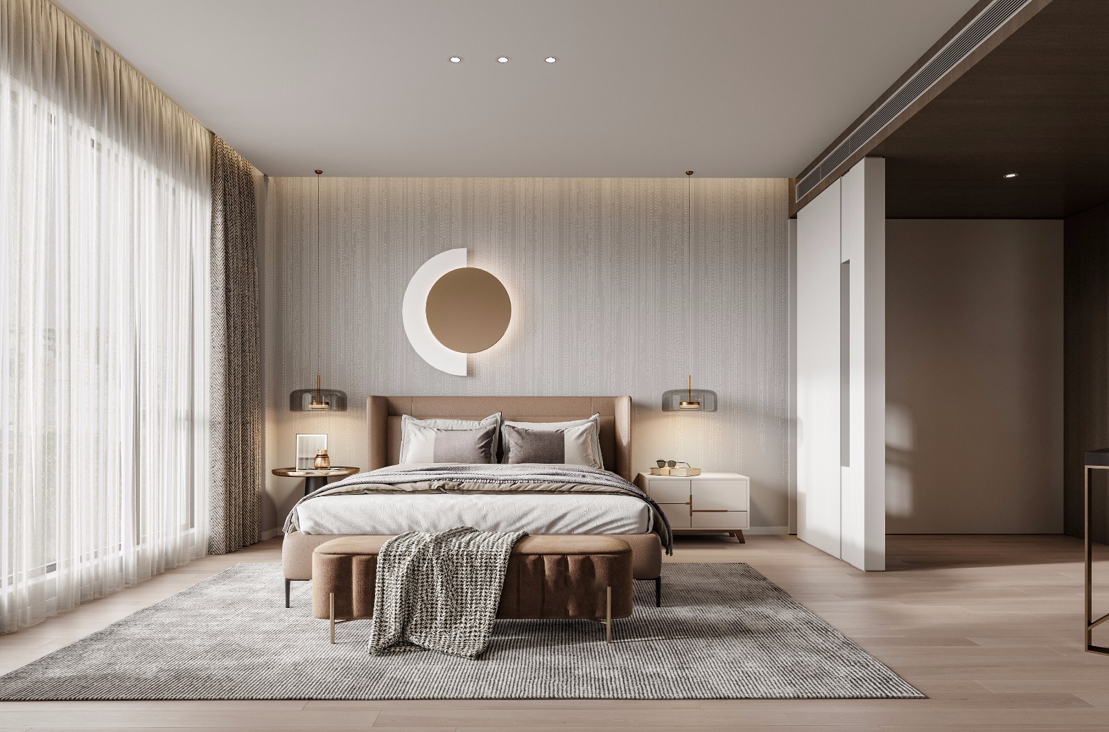 圆形吊顶的设计,增加空间的温馨感。
