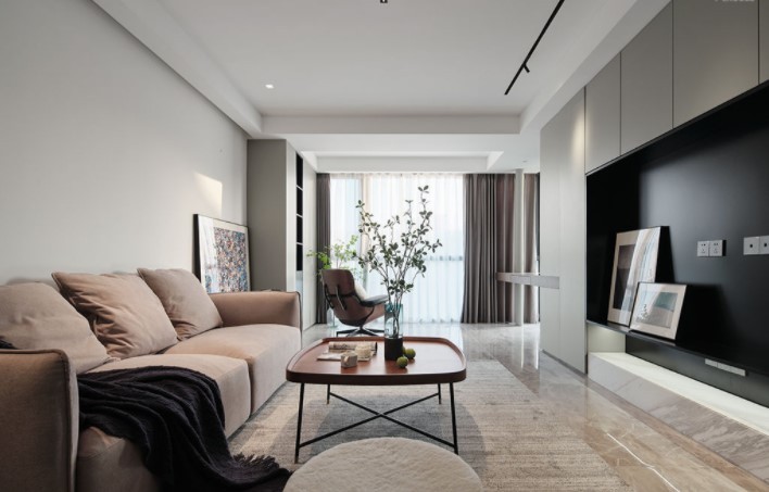 地面整体选择灰色地砖通铺,增大空间延伸感和视觉感,将阳台拆除包入客厅后,拓宽了客厅的面积。